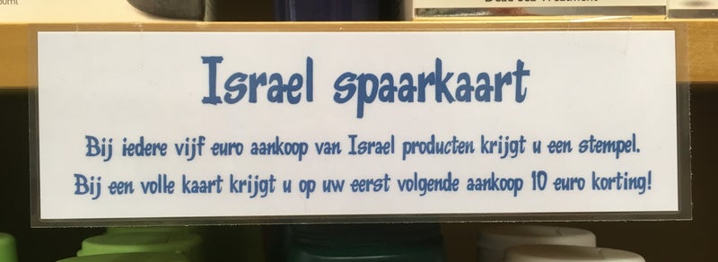 Bij iedere vijf euro die u besteedt aan Israël producten krijgt u een stempel. Bij een volle spaarkaart krijgt u op uw eerst volgende aankoop, 10 euro korting!